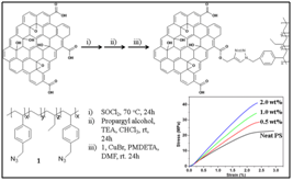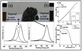 (J Mater Chem A 2013, 1, 3495; ACS Appl Mater Interfaces 2013, 5, 7122; J Mater Chem A 2014, 2, 10365) 3.高分子/石墨烯纳米复合材料制备与应用 石墨烯具有优异的导电、导热、阻隔、抗菌及力学性能。我们利用石墨烯的上述特点,开展了在高分子/石墨烯纳米复合材料的制备与应用研究,主要包括:(i) 石墨烯的表面改性及基于石墨烯的功能改性剂制备;(ii)高分子/石墨烯纳米复合材料制备技术;(iii) 轻量化高分子/石墨烯增强复合材料材料;(iv) 导电、导热、防腐、阻隔等功能石墨烯改性高分子复合材料。期望通过上述各方面的工作,获得具有实际应用价值的高性能高分子/石墨烯纳米复合材料。